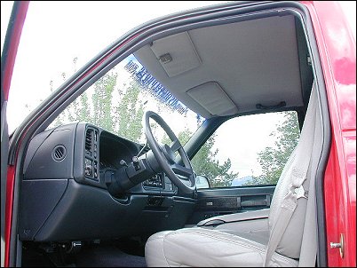 The headliner was recovered using gray headliner material purchased from a local fabric store, and was applied using a spray contact adhesive. An area auto upholsterer stripped and recovered the sun visors using the same fabric. Headliner material is produced using felt cloth backed with a foam layer about 1/8" thick. The gaps in the corners of the 2001 dash that remained after installing the A-pillar moldings were covered using a thin textured ABS plastic sheet that had been cut to shape, formed using a heat gun, then were OEM color-matched using graphite trim paint. Once painted, the filler pieces were glued in place using a contact adhesive intended for Formica.