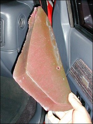 ![]() Each door panel was modified where the upper forward area flared out to meet the original 1989 dash. The new wider 2001 dash required removal of most of the flare. A new flat 1/8" thick ABS panel was plastic-welded into where the flare had been, then the joint was smoothed with polyester auto body filler and sandpaper. I used a 35-watt soldering iron to weld the new panel into position on the modified door panel. Once satisfied with the new flatter contour, the modified areas were covered with vinyl Naugahyde and contact adhesive. The photo on the left shows what was removed from the original door panel. Once the door panels modifications were complete and the original carpeted and fabric-covered panels were stripped, the door panels were repainted using an automotive interior trim paint. Once painted, the carpeted and fabric covered panels were recovered using matching automotive cloth and contact adhesive. One thing I learned in this process is that you should use a good contact adhesive, like that intended for upholstery, and not a hobby/craft spray contact adhesive. Contact adhesive produced for adhering upholstery is the real deal, and won't loosen its grip over time. Stay away from the hobby/craft contact adhesives. Ask me how I know this....