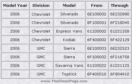 This chart represents the Vehicle Identification Number breakout points for each of listed vehicle types. If your vehicle's VIN number falls within one of the listed ranges (and you haven't already been contacted), you should contact your dealer for further instruction. Your servicing dealer can reprogram your GPCM (Glow Plug Control Module) with the appropriate glow plug calibration update using a Techline Tech II scan tool and Techline Information System (TIS) 2000 terminal. Vehicles within California, Massachusetts, Maine and Vermont should have a Recall Identification Label installed in a visible location somewhere on the radiator core support once this calibration update procedure has been completed. In addition, all California dealers should issue a "Proof of Correction Certificate" to all vehicle owners whose truck was serviced according to this recall. You may be required to present this certificate to the DMV when registering your vehicle. Any dealer vehicles remaining in inventory, and falling within the above listed VIN breakouts, should have this recall performed before it is sold. Should you need any additional assistance, please contact Chevrolet at 1-800-630-2438 or GMC at 1-866-966-9463. TDP What's New: | Feature Articles: | Product Reviews: | Member's Area: Join Us: | Duramax Diesel Page: | Advertisers: | Classified Ads: | Books: