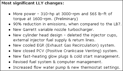 ![]() LLY Duramax 6600 Technology changes for 2004 By Jim Bigley Photos by Ron Wong The 2001 through mid model-year 2004 Duramax 6600 diesel engine was designated RPO (Regular Production Option) code LB7. The LB7 was introduced in the fall of 2000 with an industry leading 300 horsepower and 520 lb-ft torque rating. Not only was it the most powerful engine in this market segment, but it was also a revolutionary step forward in light-truck diesel engine technology and was the first competitive diesel engine designed in recent times for the current light-truck market. Numerous new technologies were engineered into the LB7 design, creating an engine package that met both emissions requirements and consumer performance expectations. Enter the LLY... Introduced in January of 2004, the RPO code LLY Duramax 6600 incorporates a number of significant technology changes. Two forces control diesel engine evolution for all engine manufacturers - Emissions compliance and market share. The technology changes introduced with the LLY address both of these forces. Creating an engine with more power and lower emissions has become more challenging, but that's exactly what the LLY delivers.