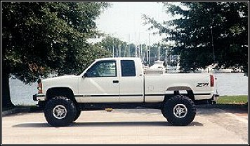 ![]() 1995 6.5TD Chevrolet K1500 XCab Z71 I have a 1995 K1500 XCab Z71 with the light duty 6.5 Turbo Diesel and 4L80-E automatic transmission. I have added a Hypertech chip, Banks Stinger system, a Gauge Works pod for the boost and exhaust temperature gauges, 6" suspension lift, 3" body lift, and a high capacity winch. The gears are the factory 3.73's and the above photo shows the 35 X 12.50 tires I originally used. In the above configuration I could cruise at 70 MPH in OD with an engine RPM of approximately 1900, 6 psi of boost, exhaust gas temperature of 450, and a coolant temperature of 195. The 0-60 times rivaled my 92 C1500 XCab with a gas 350.