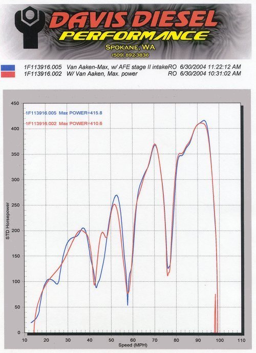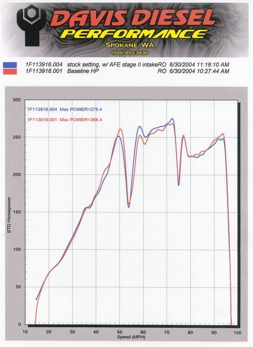 While running this truck on the dyno, shop owner Jeff Davis also reported the AFE intake systems lowered exhaust temperature by 50° F. When combined with a noticeable improvement in turbo response and a bump in power, the AFE air intake system becomes an excellent addition to any turbo diesel performance improvement program. TDP Manufacturer: Advanced Flow EngineeringCall: 1-909-898-3569 -- Fax: 1-909-489-8705 www.afefilters.com