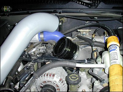 Large diameter, powder-coated and mandrel bent steel tubing included in the Stage II kit provides minimal restriction between the air filter element and the turbo inlet flange. It is more important to have a low restriction flow path on the low pressure side of the turbo than on the high pressure side. A large diameter and smooth flowing tube helps achieve maximum airflow.