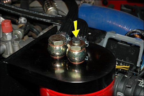 While the installation instructions show a "post-OEM" installation (fuel flows from the fuel tank to factory fuel filter, to the new auxiliary fuel filter, then to the engine), I chose a "pre-OEM" installation for a couple of reasons (fuel flows from the fuel tank to the new auxiliary fuel filter, to the original factory fuel filter, then to the engine). 1- Installing pre-OEM negates the potential for inadvertently introducing particle contamination on the "clean" side of the existing fuel supply. 2- The Lube Specialist auxiliary fuel filter is way more convenient to change and/or service than the original factory fuel filter. Whichever filter is first in line with the fuel tank will be changed approximately twice as often as the second filter. The arrows shown in this image are the connection points I used for a "pre-OEM" auxiliary fuel filter installation. The hose connection at the original fuel filter assembly should run to the center fitting (with air bleed) on the auxiliary fuel filter. Incidentally, if you choose to install your auxiliary fuel filter post-OEM, be sure the flush the output line of the new filter assembly before making the final hose connection. This'll help to reduce the possibility of contaminating the Bosch fuel injection pump.